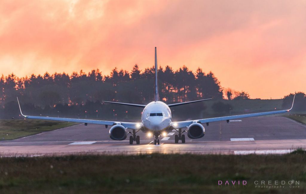 The dawn flight of an Aer Lingus regional aircraft departs for Edinburgh while the Manchester flight waits to access the runway at Cork International Airport.